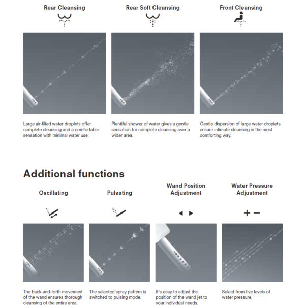 Quoi de neuf: un anneau de siège sans couture et plus facile à nettoyer. Il est également possible de retirer facilement Washlet ™ de la cuvette des toilettes pour un nettoyage approfondi. Une autre innovation dans ce modèle est l'utilisation d'un matériau à base de silicone pour Washlet ™ lui-même, ce qui rend plus difficile la saleté à s'accumuler (soi-disant "cas propre").